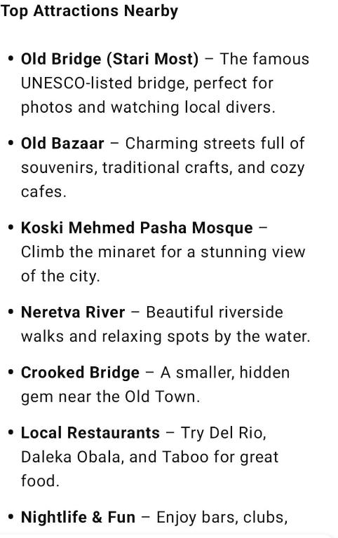 Points of interest around the accommodation include Muslibegovic House (1.9 km), Old Bridge Mostar (2.2 km), The Nobel Prize Winners Park (950 m) and Park Zrinjevac u Mostaru (1 km), giving guests a selection of locations to explore during their stay.