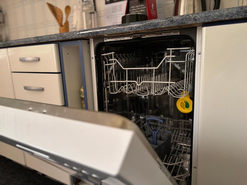 Kitchenette, Refrigerator, Dishwasher, Washing machine, Kitchen, Electric kettle, Kitchenware, Dryer, Oven, Stovetop, Toaster, Cleaning products, Coffee machine, Dining table, Wine glasses